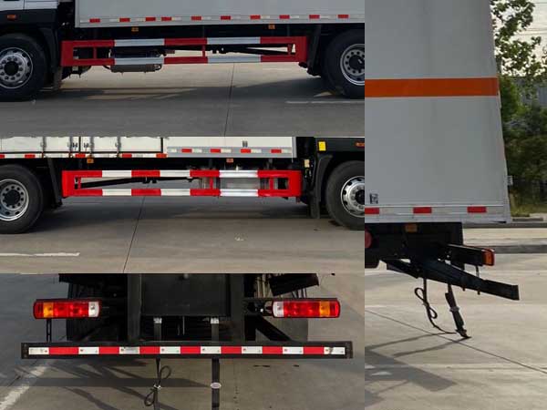 其它 | ABS型號:ABS-E,ABS/ASR-24V-4S/4M,CM4XL-4S/4M,3550D-1010;ABS生產(chǎn)企業(yè):威伯科汽車控制系統(tǒng)(中國)有限公司,東科克諾爾商用車制動系統(tǒng)(十堰)有限公司,廣州瑞立科密汽車電子股份有限公司,東科克諾爾商用車制動系統(tǒng)(十堰)有限公司;安裝有限速裝置;限速裝置限速(km/h):80;安裝有具有衛(wèi)星定位功能的行駛記錄儀;選裝描述:選裝側(cè)門型式及位置,選裝側(cè)門數(shù)量,選裝不開側(cè)門,廂體側(cè)面板選裝開百葉窗,選裝瓦楞板結(jié)構(gòu).該車型可選裝ETC車載裝置;發(fā)動機(jī)/油耗值(L/100km)對應(yīng)關(guān)系為:F4.5NS6B220/24.4,B6.2NS6B210/26;側(cè)后防護(hù)情況:側(cè)、后防護(hù)材料均為Q235,螺栓連接,后防護(hù)截面尺寸120×70mm,下邊緣離地高450mm;車廂頂部封閉且不可開啟;運(yùn)輸獨立容器(瓶)包裝的貨物;危險貨物類項號:第3類;其他說明:僅選用排氣管前置、前輪盤式制動及子午線輪胎的底盤.該車轉(zhuǎn)向輪安裝輪胎爆胎應(yīng)急防護(hù)裝置,后軸采用空氣懸架.該車為危險貨物運(yùn)輸車。選裝后尾板時,后防護(hù)材料為Q235,焊接,截面尺寸120×50mm,下邊緣離地高450mm。尾板收起狀態(tài)水平長度為290mm,尾板質(zhì)量為550kg。隨底盤選裝駕駛室;選裝燃油箱,電瓶,尿素罐,后處理,儲氣筒左右安裝位置。 | ||