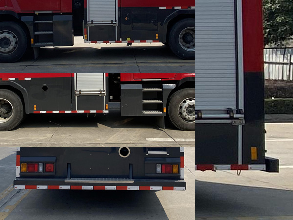 其它:罐體總?cè)莘e為6.600立方米,水罐尺寸:2390×2400×1200mm。整體式側(cè)防護(hù)結(jié)構(gòu),后防護(hù)裝置材料:Q235A,截面尺寸:100×120mm,與車(chē)輛連接方式:螺栓連接,后防護(hù)離地高度:398mm,ABS生產(chǎn)企業(yè)為浙江亞太機(jī)電股份有限公司,型號(hào)為APG3550500H1。主要專(zhuān)用裝置有消防泵、消防炮。